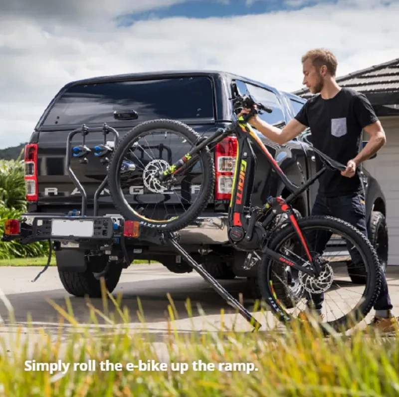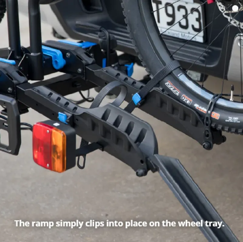 The E-Rack Ramp simply connects to the end of the E-Rack wheel tray, allowing you to push the bike up the ramp into position.