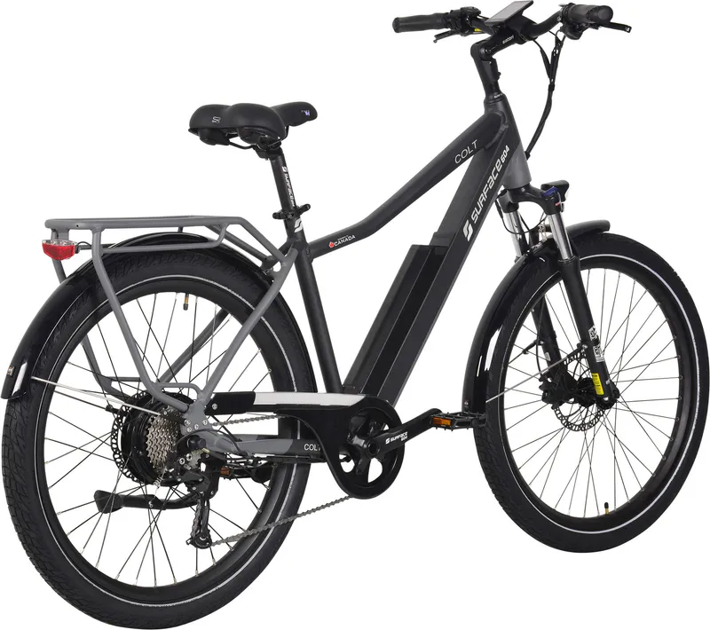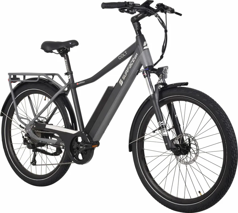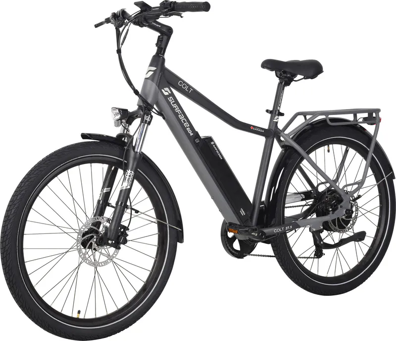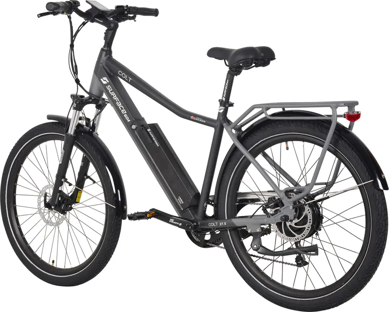 If you're looking for a commuter trail e-bike, look no further. The Colt comes with a rear rack, mudguards and integrated Spanninga lights making it perfect for commuting and light trail riding. The Colt offers a responsive torque-sensing pedal-assist to give electrical assistance that is consistent with the force applied to the pedals, as well as a thumb throttle override with full power making it easy to zip up hills and out of intersections. The control pad and display are intuitive to use and looks great. The Colt has just the right amount of comfort from the soft Selle Royal saddle to the front fork suspension with 100mm of travel making it perfect for easing achy lower backs on long journeys. Book your free test ride today!